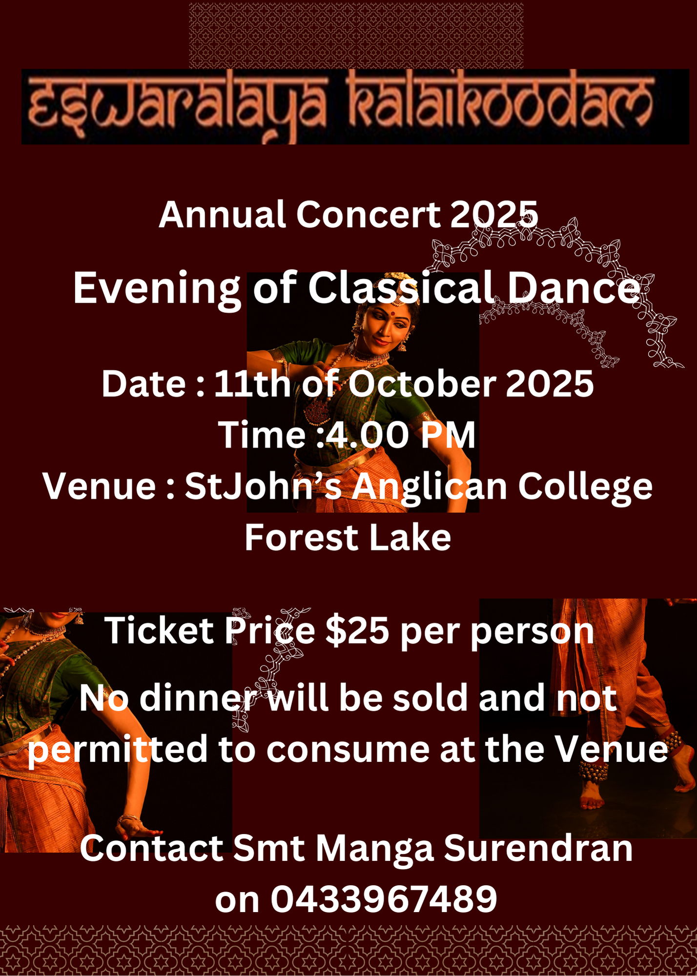 Eswaralaya Kalaikoodam (School of Dance) was first established in Sri Lanka in 1981, moved to New Zealand in 1988 and since 2003 has been successfully conducted in Southeast Queensland and is one of the leading dance institution in Queensland. Classes are conducted at Calamvale, (Southside of Brisbane), Banyo (Northside of Brisbane) and Gold Coast. In a short period, this school has touched the lives of many children, shaping their dreams and aspirations of continuing the tradition of classical dance.
